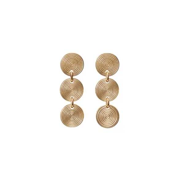 Upeissa korvakoruissa kolme pronssilevyä sitoutuu yhteen, monesta osasta koostuva kokonaisuus. Valo liikahtelee levyjen ympyröiden pinnoilla kuin toistensa ympärillä pyörivät taivaankappaleet. Näyttävissä korvakoruissa on helppo tappikiinnitys.