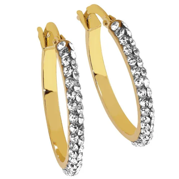 Näyttäviä kultakorvakoruja koristavat kSwarovski-ristallien rivit. Korvakorujen halkaisija on 18 mm, ja ne on valmistettu 9K kullasta.