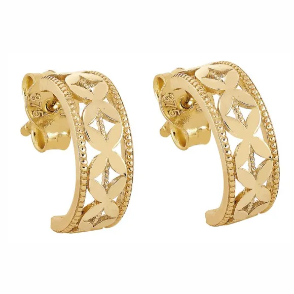 Näissä tyylikkäisissä kaaren muotoisissa kultaisissa korvakoruissa on kukkamaiset koristeet ja reunassa pienet pallot. Korvakorujen koko on 12 mm ja ne on valmistettu 9 karaatin kullasta. Koruissa on tappikiinnitys.