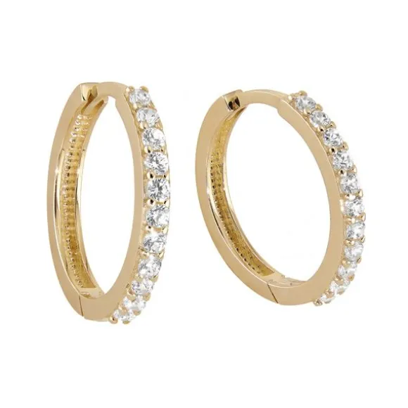 Upeissa, kultaisissa rengaskorvakoruissa tuikkivat kirkkaat zirkoniat. 9 karaatin kullasta valmistetun rungon halkaisija on 16 mm, ja leveys 2 mm.