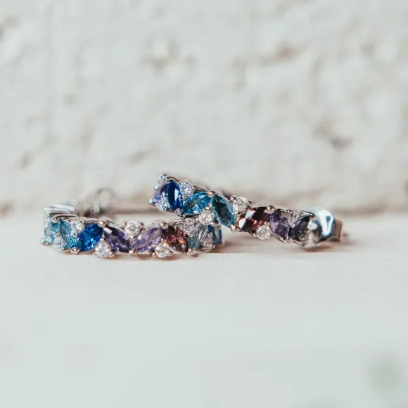 Näyttävissä Plus-korvakoruissa tuikkivat värikkäät zirkoniat kuin rivi kesän kukkasia. Tappikiinnitteisen korvakorun halkaisija on 18mm, ja leveys 4mm.