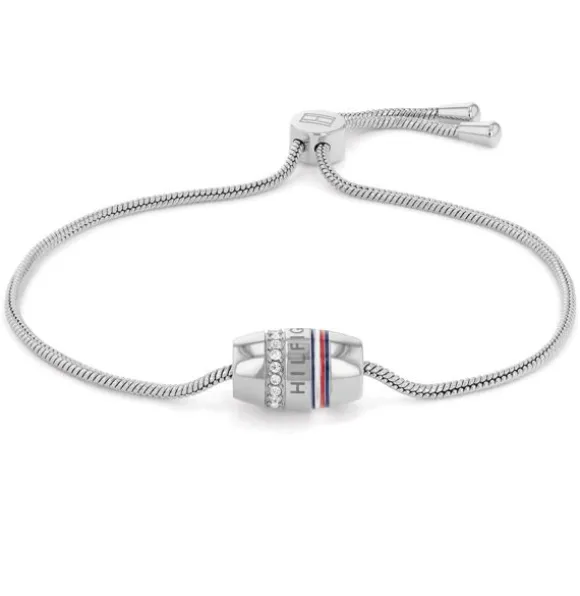 Tommy Hilfiger Mesh naisten rannekoru on valmistettu teräksestä ja siinä on kiinteä hela ,joka on koristeltu kirkkailla zirkonia kivillä ja valkoisella emalilla. Rannekkeen pituutta voi säätää helposti ranteen koon mukaan.